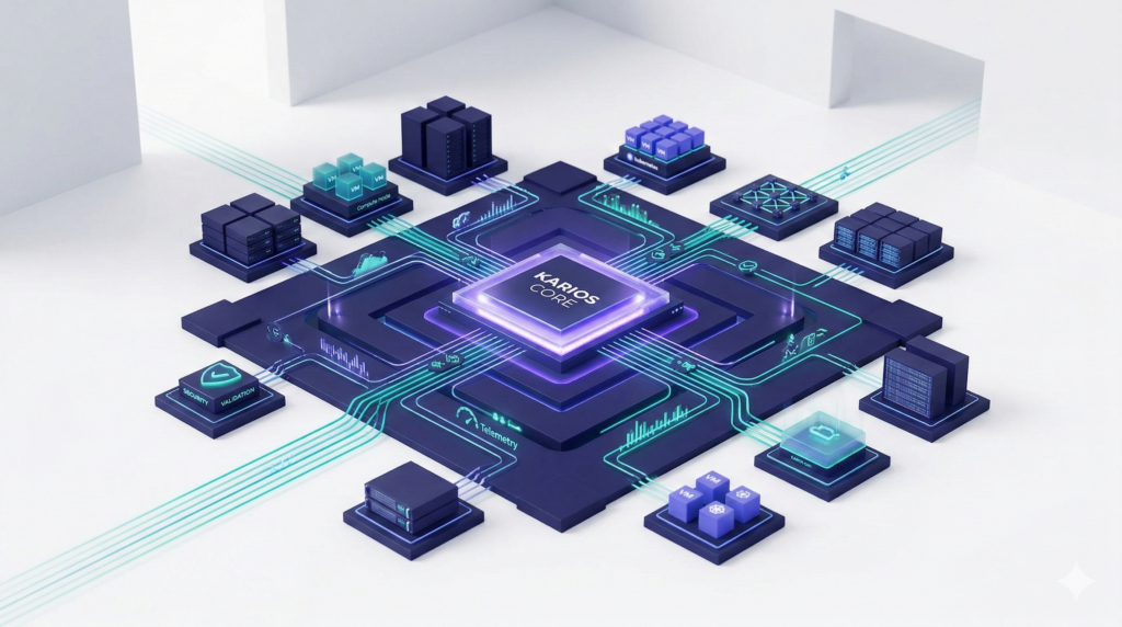 Karios was designed to eliminate fragmentation at the architectural level. As the world’s first Infrastructure Operating System, Karios integrates virtualization, Kubernetes orchestration, storage, networking, disaster recovery, security validation, observability, and lifecycle automation into a single cohesive fabric.